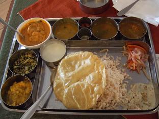 参考までに、本邦初公開、インドで僕が勤める会社の隣にある中級レベルファミリーレストランで提供される昼ごはん定食です。いろいろカレーがあって美味しそうでしょ?